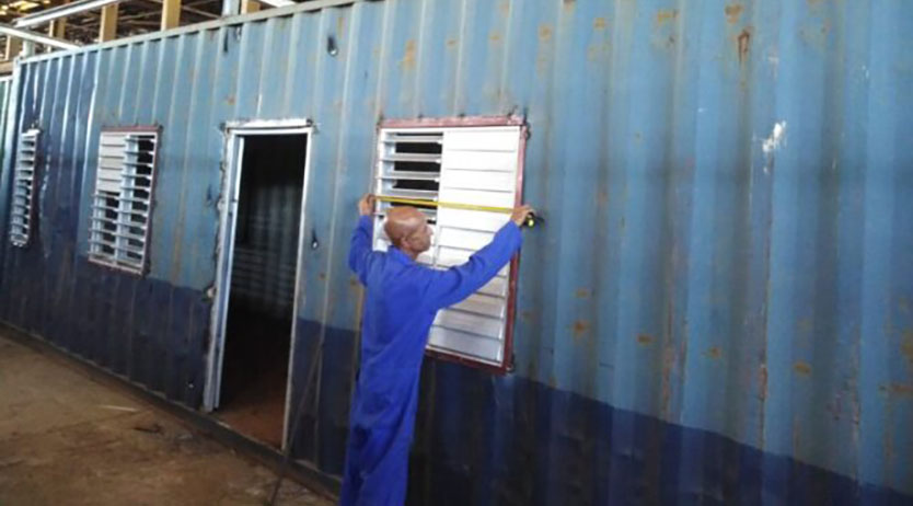 La transformación industrial de los contenedores está centralizada en la Empresa Sideromecánica Indalecio Montejo, responsable de la fase crítica de apertura de vanos para puertas y ventanas.